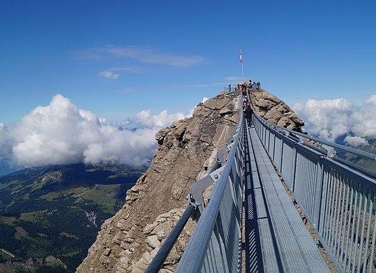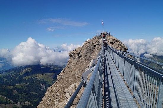 Peak Walk is a pedestrian suspension bridge linking two mountain peaks in the Swiss Alps. It is situated in the Diablerets massif of the Bernese Alps in the canton of Vaud, and connects the peak of Scex Rouge with another peak. On the other peak is the viewpoint of the Glacier 3000 company. Scex Rouge is about 5 m higher than Glacier 3000's viewpoint. Peak Walk is the world's first suspension bridge which connects two mountain peaks.
