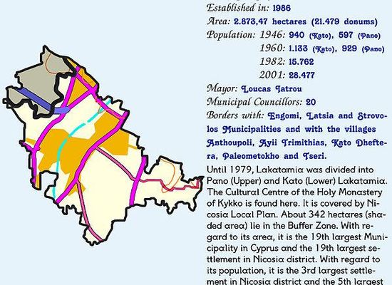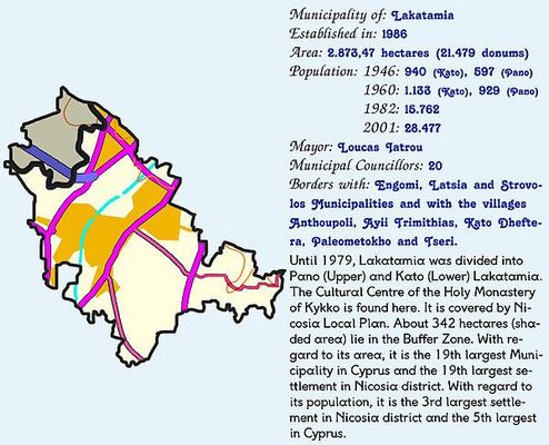 Lakatamia is a southwestern suburb of Nicosia, Cyprus. In terms of population, Lakatamia municipality is the third largest municipality in Nicosia district and the fifth largest municipality in Cyprus . In 2011 Lakatamia had a population of 38,345.Due to the expansion of the Nicosia urban area, Lakatamia has grown from two small villages into a sizeable suburb. Lower Lakatamia used to be inhabited by both Greek and Turkish Cypriots until the mid-1950s. Its name originates from "alakatia", i.e. wells, which were apparently abundant in the old village. Lakatamia Airfield, an airstrip used by the Cypriot National Guard, is located to the east of Lakatamia.