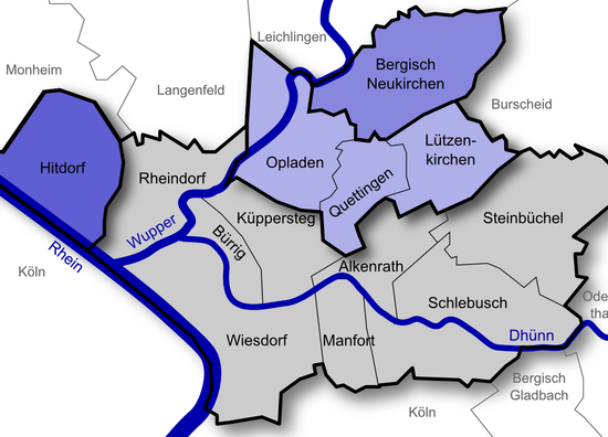 Leverkusen ) is a city in North Rhine-Westphalia, Germany on the eastern bank of the Rhine. To the south, Leverkusen borders the city of Cologne and to the north is the state capital Düsseldorf.