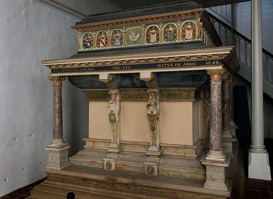 The Romanesque cathedral from around 1160 fell prey to a fire towards the end of the 13th century. The massive tower of this building has been preserved. Above two floors of sandstone, it is built of brick of Italian form. And originally, he was free – a real Italian campanile. In the Renaissance period, its west wall was clad with sandstone.