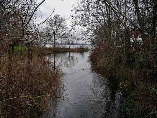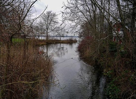 The first part of the rivers is within the village of Bünsdorf and contains several bridges. The next part passes through agricultural areas, while the second half is mostly flowing through unpopulated and hardly accessible wet areas, mostly on the western bank of the river. The final part near the farm Gut Schrinau is held back by a dam to form a small lake. Prior to the construction of the Kiel Canal it discharged into the river Eider below Gut Schrinau; nowadays it there discharges into the Kiel Canal.