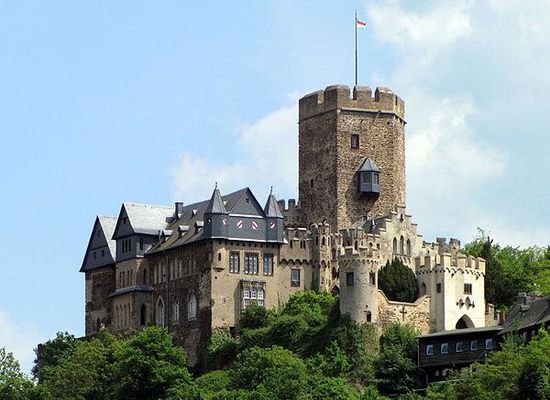 Lahneck Castle is a medieval fortress located in the city of Lahnstein in Rhineland-Palatinate, Germany, south of Koblenz. The 13th-century castle stands on a steep rock salient above the confluence of the Lahn River with the Rhine, opposite Stolzenfels Castle, in the district of Oberlahnstein. Its symmetrical plan, an oblong rectangle, is typical of the later castles of the time of the Hohenstaufen. The pentagonal shape of the bergfried is rare for castle towers.