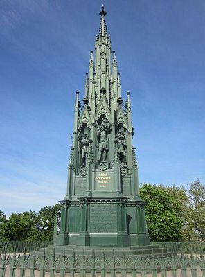 The Prussian National Monument for the Liberation Wars is a war memorial in Berlin, Germany, dedicated in 1821. Built by the Prussian king during the sectionalism before the Unification of Germany it is the principal German monument to the Prussian soldiers and other citizens who died in or else dedicated their health and wealth for the Liberation Wars fought at the end of the Wars of the Sixth and in that of the Seventh Coalition against France in the course of the Napoleonic Wars. Frederick William III of Prussia initiated its construction and commissioned the Prussian Karl Friedrich Schinkel who made it an important piece of art in cast iron, his last piece of Romantic Neo-Gothic architecture and an expression of the post-Napoleonic poverty and material sobriety in the liberated countries.
