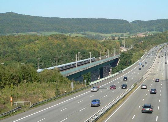 The Werra viaducts near Hedemünden, Germany are two bridges crossing the valley of the river Werra. They are located in southern Lower Saxony and provide crossings for the A 7 motorway and the Hanover-Würzburg high-speed rail line. The bridges are located 33 metres apart from each other.