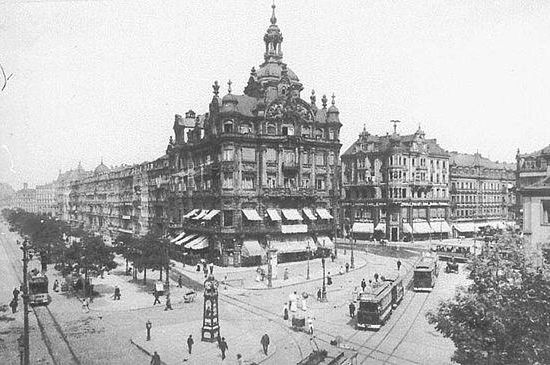 It had one tower and on its gable were statues by Hans Hartmann-MacLean. Its porch had a huge window designed by Josef Goller. The ground and first floors were faced with sandstone and the other floors' facades were plastered. It housed a restaurant and a bank. It was destroyed in February 1945 during the bombing of Dresden and the remaining ruins were demolished in 1951.