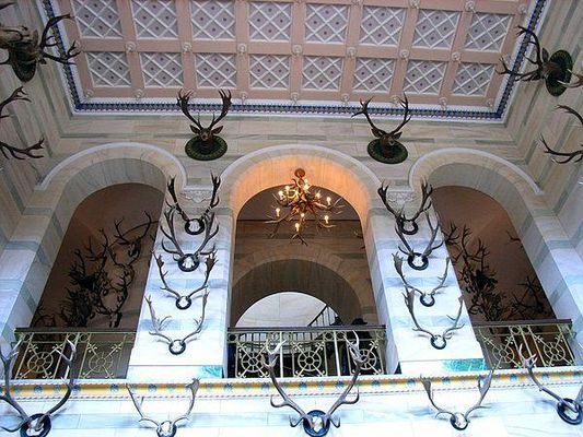 The lodge lies in the middle of the forested Granitz ridge, which covers an area of about 1,000 hectares and has been part of the Southeast Rügen Biosphere Reserve since 1991. The name Tempelberg given to the highest hill in the Granitz comes from the 18th century, when a small hexagonal belvedere stood on the site of the present schloss. The quickest way to get there is from the Baltic seaside resort of Binz on the Rügen Light Railway or the Hunting Lodge Express .