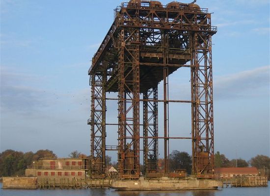 The Karnin Lift Bridge (German: Hubbrücke Karnin) is a railway bridge over the Peenestrom estuary in North Germany that was opened in 1933 and destroyed in 1945. It was part of the old Ducherow–Swinemünde railway. The lifting part of the bridge has stood since the end of the Second World War as a relic and technical monument in the middle of the Peenestrom. It was nominated for designation as a Historic Symbol of Engineering in Germany.