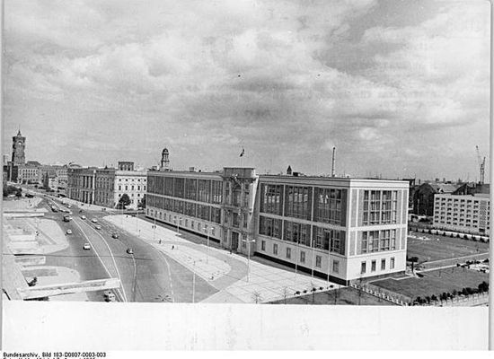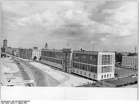 The building, which lies to the south of the Schloßplatz, was constructed from 1962 to 1964 by the architects Roland Korn and Hans-Erich Bogatzky. It incorporates in its asymmetrical facade the Karl-Liebknecht-Portal , a fraction of the facade of the former Berlin Palace comprising the balcony from which Karl Liebknecht proclaimed a "Free Socialist Republic of Germany" on 9 November 1918, on the eve of the end of World War I, two hours after Social Democrat Philipp Scheidemann proclaimed the "Republic of Germany" from a window of the Reichstag building.