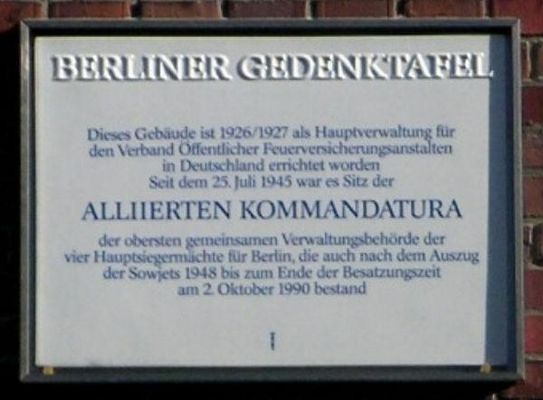 The Allied Kommandatura, or often just Kommandatura, also known as the Alliierte Kommandantur in German, was the governing body for the city of Berlin following Germany's defeat in World War II. The victorious allied powers established control of post-war Germany and other territories via shared Military Government councils, including for Berlin. The Kommandatura was often known as the little brother to the Allied Control Council, which had the same function for the whole of Germany, and was subordinate to it. It originally comprised representatives from the United States, the United Kingdom, and the Soviet Union but later included France. The Kommandatura had its home in the Berlin district of Dahlem.