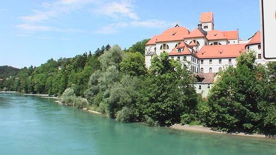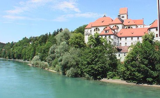 Its source is located in the Austrian state of Vorarlberg, where the river rises from lake Formarinsee in the Alps at an altitude of 1,870 metres . It flows in a north-north-easterly direction and crosses the German border, forming the Lechfall, a 12-metre-high waterfall; afterwards the river enters a narrow gorge . Leaving the Alps, it enters the plains of the Allgäu at Füssen at an elevation of 790 metres in the German state of Bavaria, where it used to be the location of the boundary with Swabia. The river runs through the city of Füssen and through the Forggensee, a man-made lake which is drained in winter. Here, it forms rapids and a waterfall.