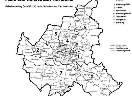 The city of Hamburg in Germany is made up of seven boroughs and subdivided into 104 quarters . Most of the quarters were former independent settlements. As of 2008 the areal organisation is regulated by the constitution of Hamburg and several laws.