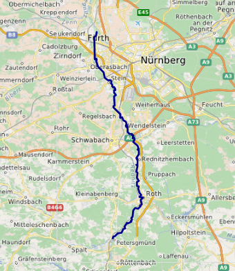The Rednitz is a 46 km long river in Franconia, Germany, tributary of the Regnitz . The Rednitz is formed by the confluence of the rivers Franconian Rezat and Swabian Rezat, in Georgensgmünd . The Rednitz flows north through Roth bei Nürnberg, Schwabach and the southwestern quarters of Nuremberg. The Rednitz joins the Pegnitz to form the Regnitz in Fürth.