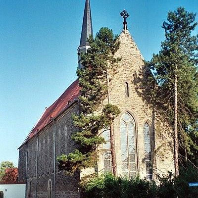 The 40-metre-long and 10-metre-wide church, built between 1264 and 1271 as a Franciscan monastery church from quarry stones, is considered the oldest surviving building in the city. On the north side it originally bordered on the cloister, so there is only one window at the east end. The south façade is divided into twelve ogival windows, which reach from the eaves to three metres above the ground. Below it are two round-arched portals. The east and west walls are divided with three-window groups, on the east gable is the original gable cross. As a monastery church of a mendicant order, the building did not have a tower, but the roof has a turret.