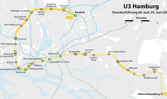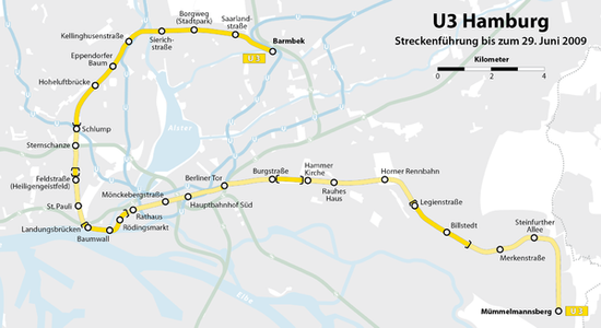 The U3 is a line of the Hamburg U-Bahn. The ring line with a length of 20.68 kilometres serves 25 stations. The first part opened in 1912. The line starts in Wandsbek-Gartenstadt and leads via Barmbek into the ring passing through the city center and back to Barmbek.
