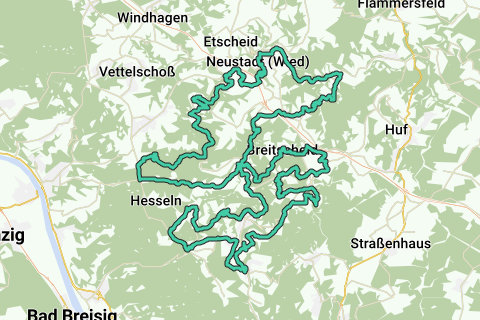 Discover all benefitsThis route starts at the parking lot by the sports center in Neustadt (Wied). The Wied is a 100 km long river that flows into the Rhine and runs through the Westerwald. The lower course of the Wied (Lower Wied Valley) has cut deep into the landscape and meanders strongly: Here you will find hills with altitude differences of up to about 250 meters. This part of the Wied is also less populated than the upper course of the Wied, so the roads in this area are relatively quiet in terms of traffic.