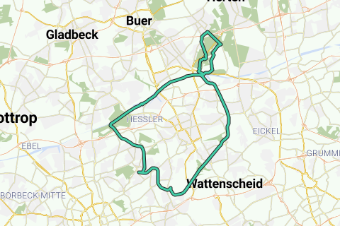 Von GE-Resse aus zum Kanal über geschotterte Waldwege zur Zoobrücke. Vom Zoo bis hinterm Nordsternpark am Kanal entlang und dort auf die neue frisch asphaltierte Zollvereinbahntrasse. Kurz vor der Zeche Zollverein trifft die Zollvereinbahntrassse auf die Erzbahntrasse die dann wieder zum Kanal führt.Die Strecke ist überwiegend geschottert nur das Teilstück vom Kanal bis E-Katernberg ist asphaltiert.