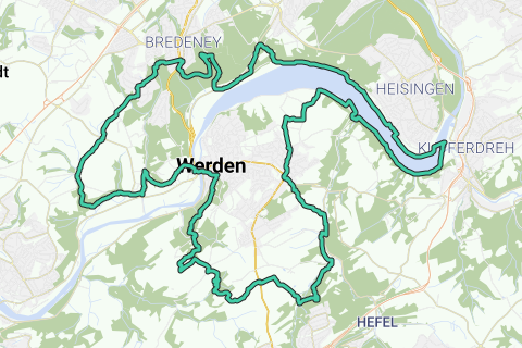 A beautiful loop through Essen. The route partially follows unpaved paths. Definitely stop by the Folkwang University of the Arts. Use public transport to reach this route. Take a moment to stop and meditate with a view of a monastery: Kloster Werden. You can start this route from anywhere. However, the church (St. Ludgerus Church) is definitely a good starting point. I rate this route 9 out of 10!