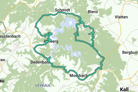Beautiful double loop around Urftsee and Rursee (between Düren and Monschau; not far from Aachen and the Belgian border) Starting from Heimbach; over Hasenfeld towards Schmidt and further towards Weidenbroich; descent via Steckenborn to Woffelsbach, and then ascent over Rurberg to Kesternich; from there descent towards Einrur, ascent to the nature reserve (formerly military zone) Vogelsang and again descending over Herhahn to Gemünd. From Gemünd ascent to Wolfgarten, descent to Schwammenaueltalsperre, over Hasenfeld back to Heimbach and from there back up towards Abbey Mariawald. Descend to Gemünd and take the rest of the road in the opposite direction (Herhahn - Vogelsang - Einrur - Kesternich - Rurberg - Woffelsbach - Weidenbroich - Schmidt - Hasenfeld).