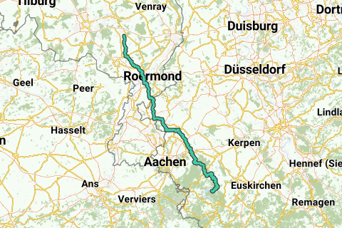 As we cross the area between Aachen and Cologne, where many towns and industrial sectors are located, we have to go directly through some villages and towns. We do this as directly as possible on the shortest route and often on exposed bike paths (one of them in Eschweiler has a drivable natural path). We pass through several smaller towns and the following larger cities: Ubach-Palenberg, Dürwich, and Vöckelsberg (Eschweiler).