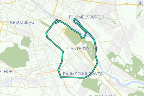 - Start and finish at "Rummelsburger Bucht" (Bay Rummelsburg)- Have a look at the right at peninsula "Alt-Stralau" [F]- canoe around "Insel der Jugend" (Isle of Youth) [G]- cross "Elsenbrücke" (bridge of Else) [H] -> left and right are clubs (Salon zur Wilden Renate; Else; Madgalena)- enjoy "Treptower Park" at the left- turn left at "Badeschiff" [I] which is an old cargo ship used as a swimming pool! super nice- now your canoeing at "Landwehrkanal" (Landwehr channel) [K] - here you can see as well clubs (like Club der Visionäre; Chalet [J]). You´re currently in Kreuzberg- next turnoff left [L] and you´re entering Neukölln. You will see club "Griessmühle" [M] as well as one of the biggest conference hotels in Berlin (Estrel) [N]- you will pass some industrial harbours and cross the highway. [O]- next turnoff again left. [P] -> now it smells like coffee, cause you´re next to a coffee factory of Jacobs [Q] ;-)- follow "Britzer Verbindungskanal" (Britz channel) -> you will now enter Treptow [R]- at the end of the channel you arrive again at river "Spree" [S] -> turn left- now you only have to canoe straight and you will get back to "Rummelsburger Bucht" -> at the left you will see "Plänterwald" [T] which is a park and an old pleasure ground. You should see the old big wheel. Sometimes moving by the wind.Around 17 km. Have fun and enjoy!