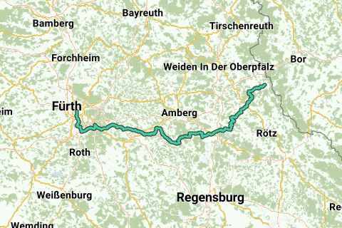 Pilgrimroute for racebikes between Eslarn and Nurnberg. The following cities are on the route: Eslarn, Schwandorf and Nurnberg.