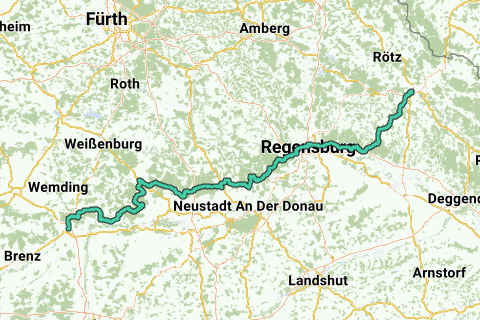 Pilgrimroute for racebikes between Cham and Donauworth. The following cities are on the route: Cham, Regensburg, Eichstatt, Donauworth.