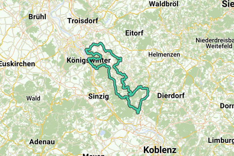 Discover all benefitsThe Siebengebirge is a mountain range that lies close to the Rhine and the city of Königswinter. The route takes you through this beautiful wooded mountain range and continues along quiet roads through the rolling and also wooded countryside in the spacious surroundings. Starting and ending is done at the Königswinter exit of the B42.