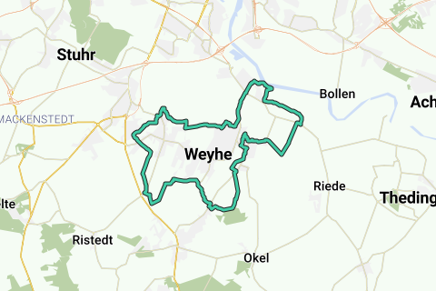 The Weyher Tour offers you a relaxed cycling tour in the Bremen metropolitan region, very close to Weyhe. With a length of 33.4 kilometers, the easily navigable, continuous route takes you past the picturesque Kirchweyher Lake and the idyllic Süstedter Creek. The route is largely paved and in excellent condition, ideal for enjoying nature. Get ready for a pleasant round trip that brings you closer to the beauty of the surroundings.