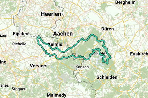 Teuven – Remersdaal – Hombourg – Montzen – Busch – Astenet – Walhorn – Raeren – Sief – Walheim – Hahn – Breinig – Breinigerberg – Vicht – ∆ Bend – Schevenhütte ∆ – Groshau – Schafberg – Untermaubach – Obermaubach – Zerkall – Brück – Abenden – Lübbenau – Blens – Hausen ∆ – Heimbach – ▲ Mariawald – Hasenfeld – ∆ Scheidam – Geisief (Schmidt) – Froitscheidt – Mausbach – ∆ Vossenack – ∆ Simonskall ▲ – Rollesbroich – Lammersdorf – Waldsiedlung – Petergensfeld – direction Eupen – Kettenis – Herbesthal – Welkenraedt – Henri-Chapelle – Merckhof – Hagelstein – De plank – Teuven