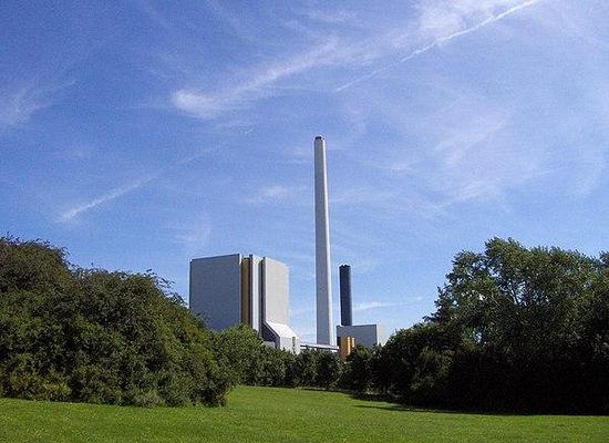 The Asnæs Power Station is a woodchip power plant operated by Ørsted A/S in Kalundborg, Denmark. It consists of three active units, which deliver 147 MW , 270 MW and 640 MW . Unit 3 went in service in 1959 and uses a 152.1-metre-tall flue gas stack, while Unit 5, which went into service in 1981, uses a 220.1-metre-tall flue gas stack, the third tallest in Denmark. Its two 60m high coal cranes were dismantled in 2016.