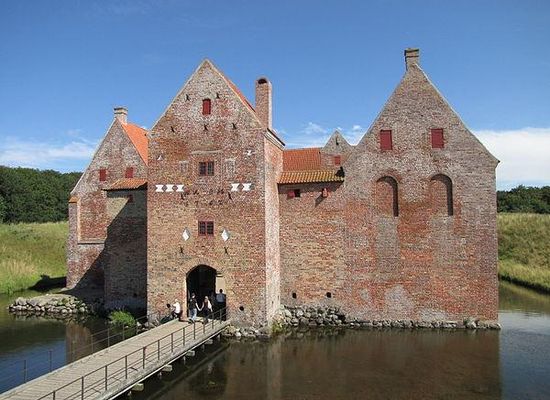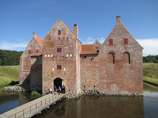 Spøttrup Castle is a well-preserved medieval defensive castle located 17 km northwest of Skive in Jutland, Denmark.The estate was transferred to the Diocese of Viborg in 1404. It became the property of the Crown in 1536 and was sold to Henrik Below , a nobleman with the Danish court. The oldest section of the building is the south wing, which was constructed c. 1521. The east and north wings followed between 1525 and 1530. The western end of the north wing was destroyed by an incoming tidal wave in 1534. The large arched windows were walled up, leaving only narrow sighting slits. The oldest part of the building is the cellar with cross vaults supported by pillars. The ramparts and the double moat served to defend the castle from cannon fire.