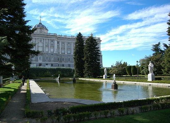 In 1933, clearing of the stable buildings was begun, and construction of the gardens begun, which were only completed in the late 1970s. The gardens have a formal Neoclassic style, consisting of well-sheared hedges, in symmetric geometrical patterns, adorned with a pool, statues and fountains, with trees also disposed in a symmetrical geometric shape. The statues are those of Spanish kings, not intended originally to even grace a garden, but originally crowding the adjacent palace. The tranquil array is a peaceful corner from which to view the palace.