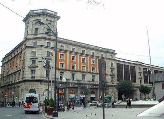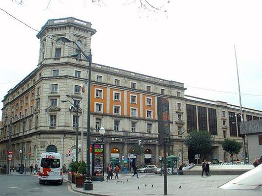 The Abando Indalecio Prieto railway station , usually known simply as Bilbao-Abando and previously known as Estación del Norte is a terminal railway station in Bilbao, Basque Country . The name comes from Abando, the district in which the station is located, and Indalecio Prieto, who was Minister of Public Works during the Second Spanish Republic. The station serves as the terminus station for several long and medium distance services operated by Renfe as well as commuter rail services within the Bilbao metropolitan area operated by Cercanías. The station has direct access to Metro Bilbao and to the tram, as well as many local and regional bus lines. The railway station Bilbao-Concordia, operated by Renfe Feve is located in close proximity. After the construction of the high-speed line Basque Y is finished, Bilbao-Abando will serve as the western terminus, which will involve the creation of a completely new station replacing the current one.