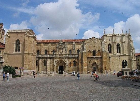 The Basílica de San Isidoro de León is a church in León, Spain, located on the site of an ancient Roman temple. Its Christian roots can be traced back to the early 10th century when a monastery for Saint John the Baptist was erected on the grounds.In 1063 the basilica was rededicated to Saint Isidore of Seville. Isidore was archbishop of Seville, and the most celebrated academic and theologian of Visigothic Spain in the period preceding the Arab invasions. With the agreement of Abbad II al-Mu'tadid, the Muslim ruler of Seville, Isidore's relics were brought to Leon where they could be interred on Christian soil. The tomb of the saint still draws many visitors today. An equestrian statue of Saint Isidore dressed as a Moor-slayer is visible, along with many other sculptures, high on the facade.