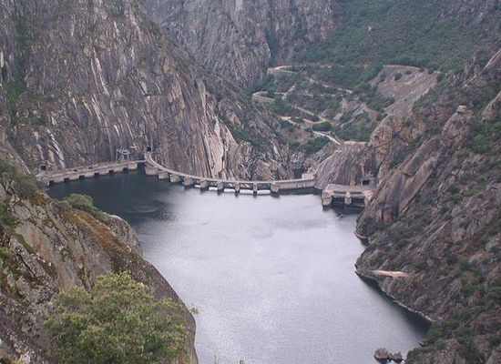 Aldeadávila Dam is a concrete arch-gravity dam on the Duero River in Spain, near the border with Portugal. The nearest town is Aldeadávila de la Ribera in the Province of Salamanca, about 11.3 kilometres to the east. The nearest Portuguese town is Fornos in Bragança District, about 8 kilometres to the southwest. The Portuguese side of the river around the dam site lies within the Arribes del Duero Natural Park.