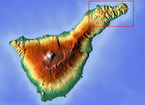 Macizo de Anaga is a mountain range in the northeastern part of the island of Tenerife in the Canary Islands. The highest point is 1,024 m . It stretches from the Punta de Anaga in the northeast to Cruz del Carmen in the southwest. Anaga features the mountain peaks of Bichuelo, Anambro, Chinobre, Pico Limante, Cruz de Taborno and Cruz del Carmen. The mountains were formed by a volcanic eruption about 7 to 9 million years ago making it the oldest part of the island. Since 1987 it has been protected as a "natural park", reclassified as "rural park" in 1994. Since 2015 it is also Biosphere Reserve and is the place that has the largest number of endemic species in Europe.