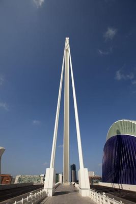 The Assut de l'Or Bridge is a white single-pylon cable-stayed bridge in the City of Arts and Sciences in Valencia, Spain, designed by Valencian architect and civil engineer Santiago Calatrava and completed in December 2008. The name l'Assut de l'Or is Valencian for the Dam of the Gold and refers to a dam that was located nearby, although locally it is referred to as El Jamonero or Pont de l'Arpa, Spanish: Puente del Arpa . Calatrava called it the Serreria Bridge.