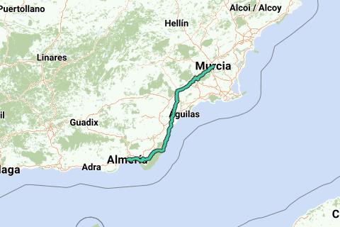<p><a class="routeYou_embed" href="https://app.routeyou.com/en-es/route/view/15720563?utm_source=embed&utm_medium=article&utm_campaign=routeshare&navigation=external" title="Almeria - Murcia - RouteYou" target="_blank"><img src="https://image.routeyou.com/embed/route/960x670/15720563-en@2x.png" style="width: 100%; height: auto;" alt="Almeria - Murcia"></a></p>