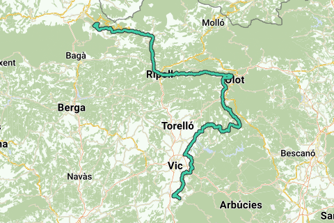 This is the Ride2Barca - Day 15: Molina-Seva. This route takes a detour through the city of Olot and the volcanic region of Olot, which is also a national park. The original route was shorter but followed the heavily trafficked road from Ripoll to Torello, which turned out to be very dangerous and is clearly not recommended for bicycles. This route is part of the cycling project Gent-Barcelona by LadiesFunRide, which was carried out in 2012.