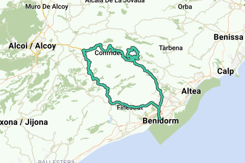 Discover all benefitsFrom Benidorm, you ascend via the climb of Puerto de Finestrat to Finestrat. Then follows the long climb to the top of Puerto de Tudons. After the descent, you go down towards Guadalest. What many people do not know is that you can take secondary paved roads on the left and right of the main road CV-70, which adds extra elevation. There are three on this route: