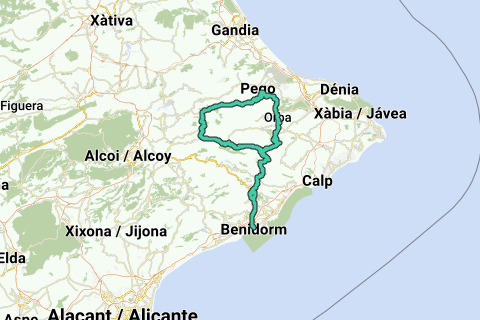 Discover all benefitsFrom Benidorm, the route first takes you along busy roads towards Collosa d'en Sarrià. But from there, it becomes beautiful and the roads get much quieter. First, you climb Coll de Rates via Tàrbena (you can choose to continue climbing to the antennas at the top). After the 6 km long descent, you ride towards Pego, and just before Pego, the beautiful Alto de Ebo begins. Enjoy the winding road through the forest at the base of the climb and the stunning views further up the ascent. After the relatively short descent to Vall d'Ebo, there’s an unpleasant stretch on a high plateau with ups and downs, sometimes with gradients hitting 16%. After passing the village of Alcala de la Jovada, you'll tackle the climb of Puerto de Tollos, a very remote and narrow road, with some steep sections. From Tollos and Facheca, you head towards Castell de Castells. Then comes the climb towards Tarbena from Collado de Bixau, which briefly hits 14%. Via Tarbena and Polop, you head back towards Benidorm.