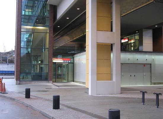 Kalasatama metro station is a ground-level station on the Helsinki Metro, in the capital city of Finland. The station was opened on 1 January 2007, and it serves the eastern part of the central Helsinki district of Sörnäinen's quarter Kalasatama. The area is mainly composed of offices and apartments, with new residential and commercial developments being under construction in the area, including the shopping center Redi. The port facilities previously in the area were moved to Vuosaari Harbour in 2008.