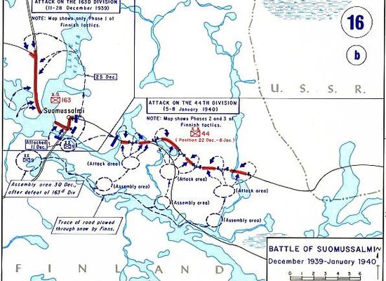The Battle of Suomussalmi was a battle fought between Finnish and Soviet forces in the Winter War. The action took place from November 30, 1939, to January 8, 1940. The outcome was a Finnish victory against superior forces. This battle is considered the clearest, most important, and most significant Finnish victory in the northern half of Finland. In Finland, the battle is still seen today as a symbol of the entirety of the Winter War itself.