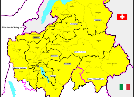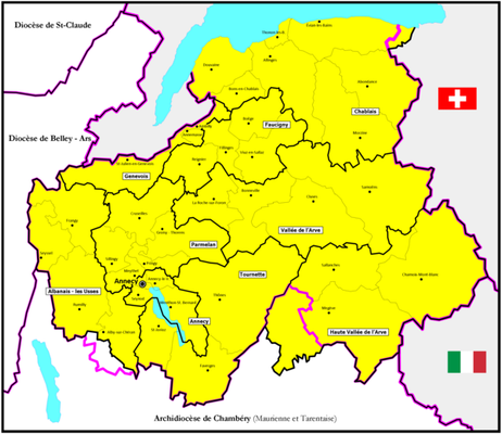 The Roman Catholic Diocese of Annecy is a diocese of the Latin Rite of the Roman Catholic Church in France. Saint-Gingolph VS, a town in the Swiss canton of Valais, is also part of the diocese. Originally erected in 1822, after the Concordat as a subdivision of the Roman Catholic Archdiocese of Chambéry, the diocese comprises the entirety of the department of Haute-Savoie in the Region of Rhône-Alpes. Only recently, in 2002, did the metropolitan change. The diocese is now suffragan to the Archdiocese of Lyon. The current bishop is Yves Le Saux, appointed in 2022.
