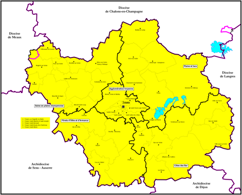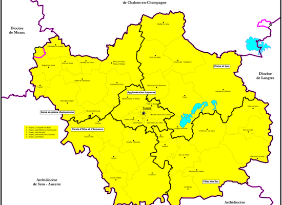 The Diocese of Troyes is a Latin Church ecclesiastical territory or diocese of the Catholic Church in Troyes, France. The diocese now comprises the département of Aube. Erected in the 4th century, the diocese is currently a suffragan diocese in the ecclesiastical province of the metropolitan Archdiocese of Reims. It was re-established in 1802 as a suffragan of the Archbishopric of Paris, when it comprised the départements of Aube and Yonne and its bishop had the titles of Troyes, Auxerre, and Châlons-sur-Marne. In 1822 the See of Châlons was created and the Bishop of Troyes lost that title. When Sens was made an archdiocese, the episcopal title of Auxerre went to it and Troyes lost also the département of Yonne, which became the Archdiocese of Sens. The Diocese of Troyes covers, besides the ancient diocesan limits, 116 parishes of the ancient Diocese of Langres and 20 belonging to the ancient diocese of Sens. On 8 December 2002, the Diocese of Troyes was returned to its ancient metropolitan, the Archbishop of Reims. As of 2014, there was one priest for every 2,710 Catholics.