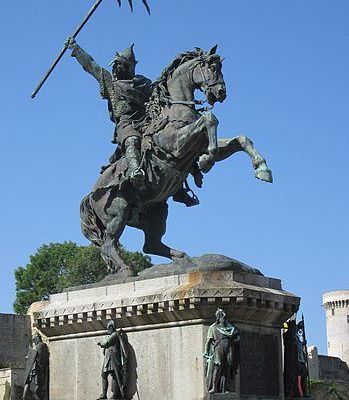 The statue of William the Conqueror is located in his birthplace, Falaise, Calvados, about 30 kilometres southeast of Caen, France. It depicts William the Conqueror, Duke of Normandy and King of England, on a horse, and is surrounded by statues of his six ducal predecessors. It is the work of the French sculptor Louis Rochet.