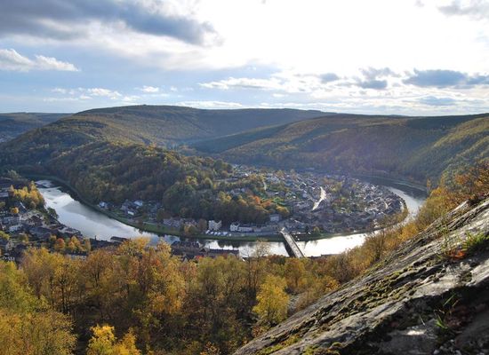 The most spectacular meander in France with the one seen since "La Longue Roche." La Roche à Sept Heures is located in the communal forest of Monthermé . This site is located at the top of steep rocky spurs overlooking the Meuse river and the small town of Monthermé. The name Roche à Sept Heures is said to have a very common origin: it comes from the fact that at seven o'clock in the morning, the sun shining on this rocky spur gives it a very visible glow. Indeed, it is made up of quartzites, compact siliceous rocks, rich in quartz, which reflect light. The view from this site offers a very picturesque panorama of this part of the Meuse. The major interest lies in the meander, considered to be the most spectacular in France, in the convex portion of which the town of Monthermé has settled. This site is close to that of La Longue Roche.