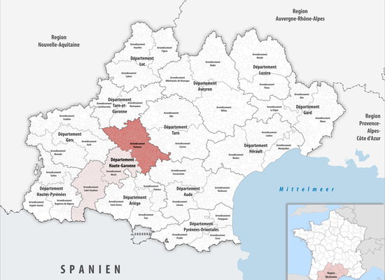 The arrondissement of Toulouse is an arrondissement of France in the Haute-Garonne department in the Occitanie region. It has 225 communes. Its population is 1,049,948 , and its area is 2,538.9 km2 .The arrondissement of Toulouse was created in 1800. In January 2017 it lost the commune Auragne to the arrondissement of Muret, and it gained the commune Aignes from the arrondissement of Muret.