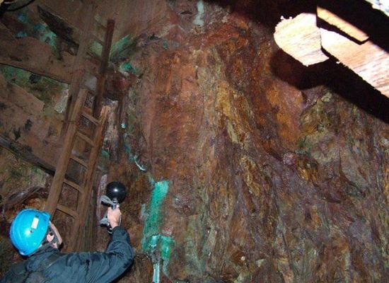 The visit is carried out with equipment provided on site (oilskin and helmet). A guide will allow you to discover nearly 800 m of spacious galleries with walls covered with neoformed concretions of copper sulphate (blue) and iron hydroxide in the form of rust brown stalactites. Worked with explosives, large lower cavities allow you to realize the enormous quantity of ore extracted (hematite and pyrite). Former flooded shafts are still visible and gave access to the six lower floors, which are now inaccessible