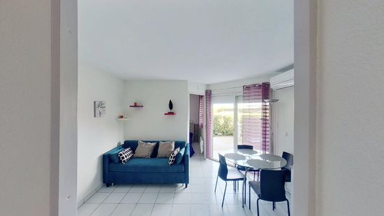 Apartment of 28m2 located on the ground floor of a small collective with a terrace and small garden of 14 m2 surrounded by hedges. Direct access to the beach. The living room consists of a dining area and a sitting area with a sofa bed for 2 people, TV, DVD player. The co...
